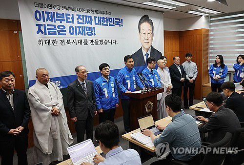 민주당 전북도당은 이날 도의회에서 선대위 출정식 기자회견을 열고 "대선에서 반드시 승리해 도민 여러분의 삶에 희망과 행복을 드리는 새로운 시대를 열겠다"고 밝혔다.