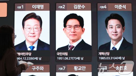 (과천=뉴스1) 박지혜 기자 = 제21대 대통령 선거 공식 선거운동이 시작된 12일 경기도 과천시 중앙선거관리위원회에 마련된 대통령선거 종합상황실 전광판에 후보자들의 사진이 게시돼 있다. 2025.5.12/뉴스1