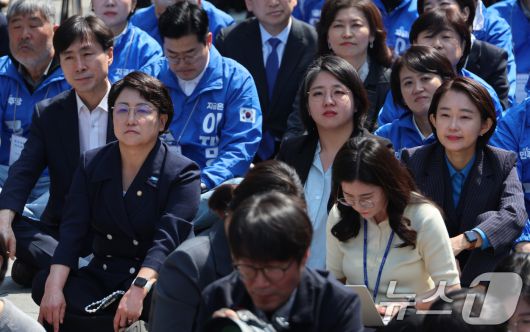(서울=뉴스1) 안은나 기자 = 조국혁신당 김선민 대표 권한대행 등 야4당 대표들이 6·3 대통령선거 공식 선거운동 첫날인 12일 서울 광화문 청계광장에서 열린 더불어민주당 이재명 대선 후보의 출정식 및 첫 유세에서 이 후보의 연설을 듣고 있다. 왼쪽부터 사회민주당 한창민 대표, 조국혁신당 김선민 대표 권한대행, 기본소득당 용혜인 대표, 진보당 김재연 상임대표. (공동취재) 2025.5.12/뉴스1