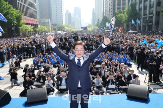 [이데일리 방인권 기자] 이재명 더불어민주당 대선 후보가 6·3 대통령선거 공식 선거운동 첫날인 12일 서울 광화문 청계광장에서 열린 출정식 및 첫 유세에서 두 손을 번쩍 들고 있다.