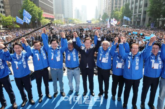 [이데일리 방인권 기자] 이재명 더불어민주당 대선 후보가 6·3 대통령선거 공식 선거운동 첫날인 12일 서울 광화문 청계광장에서 열린 출정식 및 첫 유세에서 두 손을 번쩍 들고 있다.