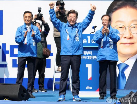 [서울=뉴스핌] 정일구 기자 = 이재명 더불어민주당 대선 후보가 6·3 대통령선거 공식 선거운동 첫날인 12일 서울 광화문 청계광장에서 열린 출정식 및 첫 유세에서 운동복과 운동화를 전달받은 뒤, 손을 번쩍 들고 있다. 2025.05.12 mironj19@newspim.com