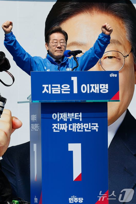 (서울=뉴스1) 안은나 기자 = 이재명 더불어민주당 대통령 후보가 공식 선거운동 첫날인 12일 오전 서울 중구 청계광장에서 열린 출정식에서 연설을 마친 뒤 두 팔을 번쩍 들고 있다. 2025.5.12/뉴스1coinlocker@news1.krCopyright ⓒ 뉴스1. All rights reserved. 무단 전재 및 재배포, AI학습 이용 금지.