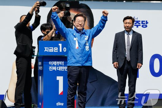 (서울=뉴스1) 안은나 기자 = 이재명 더불어민주당 대통령 후보가 공식 선거운동 첫날인 12일 오전 서울 중구 청계광장에서 열린 출정식에서 연설을 마친 뒤 두 팔을 번쩍 들고 있다. 2025.5.12/뉴스1coinlocker@news1.krCopyright ⓒ 뉴스1. All rights reserved. 무단 전재 및 재배포, AI학습 이용 금지.