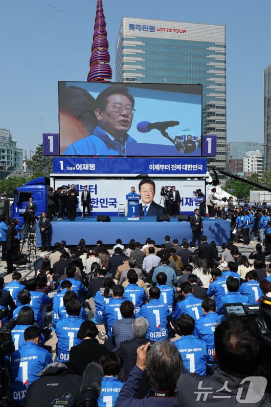 (서울=뉴스1) 안은나 기자 = 이재명 더불어민주당 대통령 후보가 공식 선거운동 첫날인 12일 오전 서울 중구 청계광장에서 열린 출정식에서 연설을 하고 있다. 2025.5.12/뉴스1
