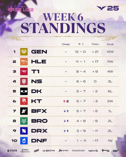 리그오브레전드 챔피언스코리아는 7일부터 11일까지 서울 LCK 아레나에서 열린 2025 LCK 정규 시즌 6주 차 결과를 전했다. 한화생명e스포츠가 11연승을 질주하면서 젠지와 함께 선두권을 형성했다.