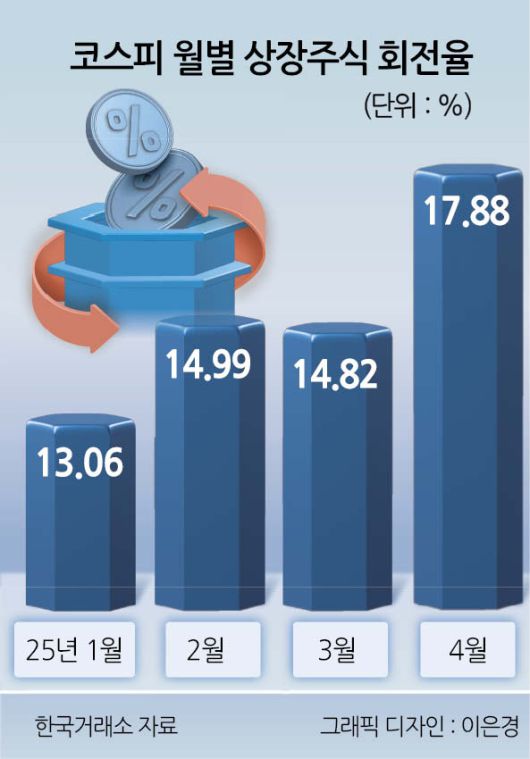 12일 한국거래소에 따르면 지난 4월 한 달간 코스피 상장주식 회전율은 17.88%인 것으로 나타났다. 이는 작년 6월 기록한 19.54% 이후 10개월 만에 가장 높은 수치다. 코스닥 월간 상장주식 회전율을 봤을 때도 지난달엔 38.61%로 작년 3월 40.71% 이후 13개월 만에 최고치를 찍었다.