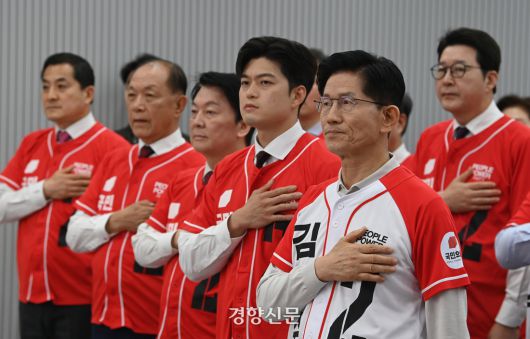 김문수 국민의힘 대선 후보가 12일 서울 여의도 국민의힘 중앙당사에서 열린 중앙선대위 임명장 수여식에서 국민의례를 하고 있다. 성동훈 기자 |