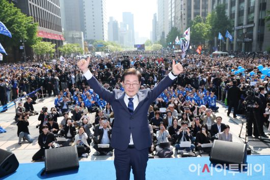 아시아투데이 송의주 기자 = 이재명 더불어민주당 대선 후보가 6·3 대통령선거 공식 선거운동 첫날인 12일 '빛의 혁명'을 상징하는 공간인 서울 광화문 청계광장에서 첫 유세를 시작하며 두 팔을 번쩍 들고 있다. ⓒ "젊은 파워, 모바일 넘버원 아시아투데이"