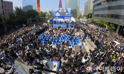 아시아투데이 송의주 기자 = 대통령 선거운동 첫날인 12일 서울 종로구 청계광장에 많은 더불어민주당원과 지지자들이 운집한 가운데 이재명 후보가 인사하고 있다. ⓒ "젊은 파워, 모바일 넘버원 아시아투데이"
