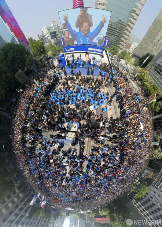 [서울=뉴스핌] 정일구 기자 = 대통령 선거운동 첫날인 12일  서울 종로구 청계광장에 많은 더불어민주당원과 지지자들이 운집한 가운데 이재명 후보가 인사 하고있다.  2025.05.12 mironj19@newspim.com