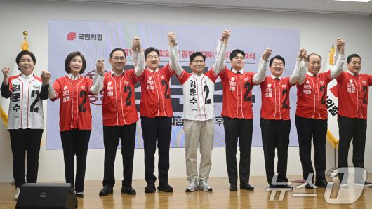 (서울=뉴스1) 이광호 기자 = 김문수 국민의힘 대통령 후보와 공동선대위원장들이 12일 오전 서울 영등포구 여의도 중앙당사에서 열린 중앙선대위 임명장 수여식에서 손을 맞잡아 들어보이며 기념촬영을 하고 있다. 왼쪽부터 양향자, 나경원, 주호영, 권성동 공동선대위원장, 김 후보, 김용태, 안철수, 황우여 공동선대위원장, 박대출 총괄지원본부장.(공동취재) 2025.5.12/뉴스1