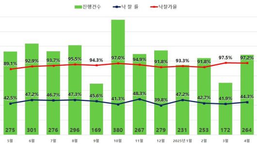 12일 경·공매 데이터 전문기업 지지옥션이 발표한 '2025년 4월 경매동향보고서'에 따르면, 전국 아파트 경매 진행건수는 3175건으로 전월(2888건) 대비 약 10% 증가했다.