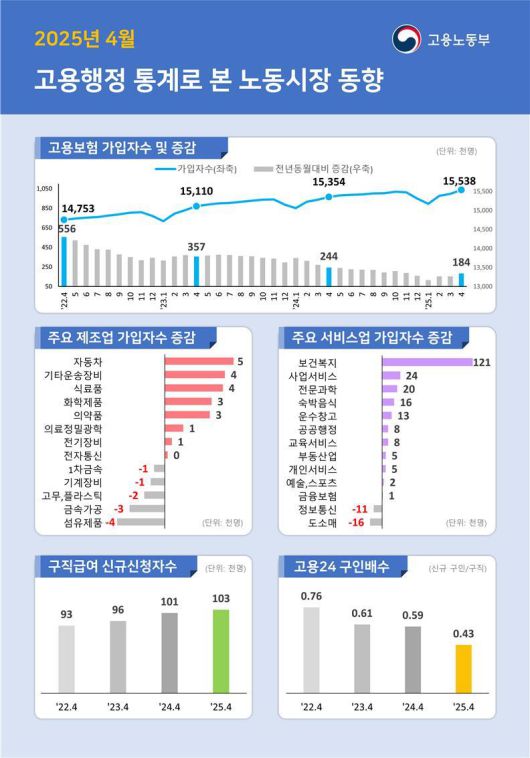 12일 고용노동부가 발표한 '2025년 4월 고용행정 통계로 본 노동시장 동향'에 따르면, 4월 고용보험 상시가입자 수는 1553만 8000명으로, 지난해 같은 달보다 18만 4000명(1.2%) 증가했다. 이는 최저였던 2020년 4월 16만 3000명 이후 5년 만에 가장 낮은 증가 폭이다.