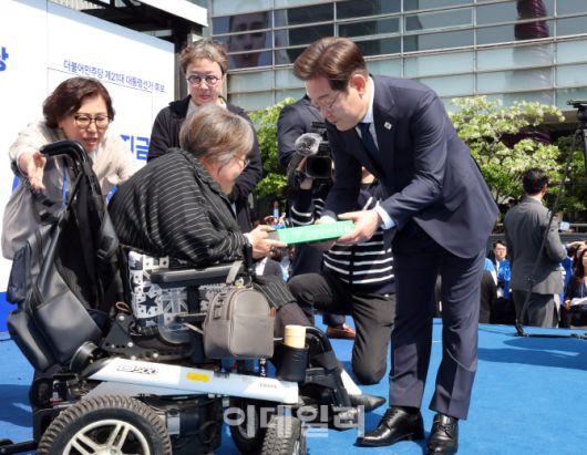 [이데일리 방인권 기자] 이재명 더불어민주당 대선 후보가 6·3 대통령선거 공식 선거운동 첫날인 12일 서울 광화문 청계광장에서 열린 출정식 및 첫 유세에서 박김영희씨로부터 녹서를 전달받고 있다.