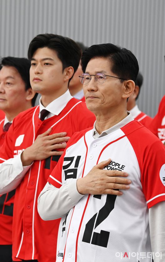 아시아투데이 이병화 기자 = 김문수 국민의힘 대선 후보와 국민의힘 비상대책위원장으로 내정된 김용태 의원이 12일 오전 서울 영등포구 여의도 국민의힘 중앙당사에서 열린 중앙선대위 임명장 수여식에서 국민의례를 하고 있다. ⓒ "젊은 파워, 모바일 넘버원 아시아투데이"