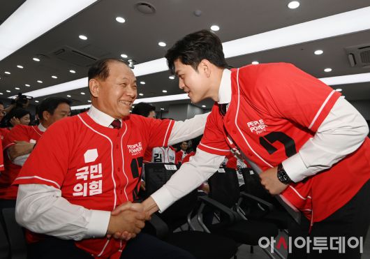 아시아투데이 이병화 기자 = 국민의힘 비상대책위원장으로 내정된 김용태 국민의힘 중앙선거대책위원회 공동선거대책 위원장과 황우여 공동선대위원장이 12일 오전 서울 영등포구 여의도 국민의힘 중앙당사에서 열린 중앙선대위 회의 및 중앙선대위 임명장 수여식에서 인사하고 있다. ⓒ "젊은 파워, 모바일 넘버원 아시아투데이"