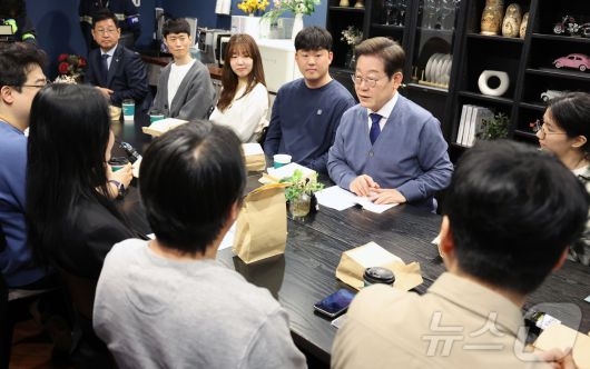 (성남=뉴스1) 안은나 기자 = 이재명 더불어민주당 대선후보가 제21대 대통령선거 공식 선거운동이 시작된 12일 경기 성남시 분당구 판교역 인근 미팅룸에서 열린 'K-혁신' 브라운백 미팅에서 IT 개발자들과 대화하고 있다. (공동취재) 2025.5.12/뉴스1