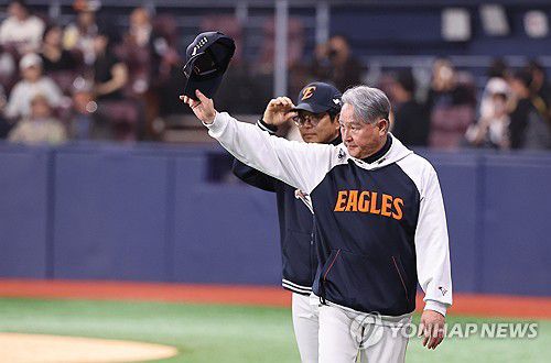 (서울=연합뉴스) 임화영 기자 = 11일 서울 고척스카이돔에서 열린 프로야구 한화 이글스와 키움 히어로즈의 경기에서 8-0으로 승리한 한화 김경문 감독이 관중을 향해 인사하고 있다. 2025.5.11 hwayoung7@yna.co.kr