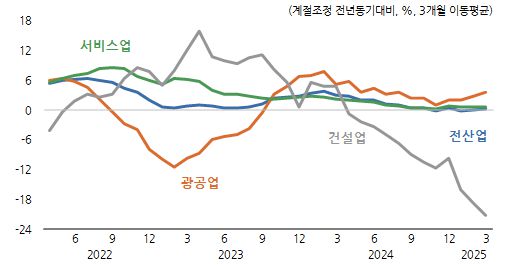 반도체를 중심으로 제조업 생산은 양호한 흐름을 보이지만 건설업 부진이 지속되면서 생산과 내수 증가세는 낮은 수준에 머무르고 있다. 미국 관세 인상에 따른 통상 여건 악화로 일평균 수출이 대미 수출을 중심으로 감소하는 상황이다.