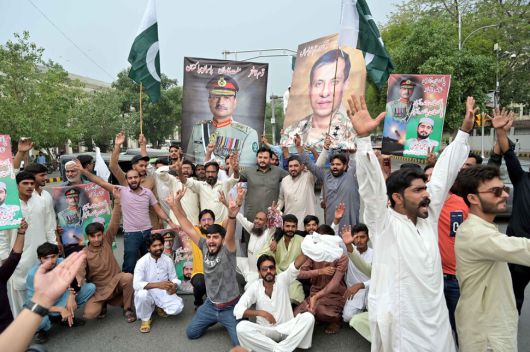 10일 미국의 중재로 인도와 파키스탄 간의 휴전이 선언된 뒤, 파키스탄 주민들이 국경 인근에서 전투에 참여한 장군의 사진을 내걸고 환호하고 있다. EPA 연합뉴스 |