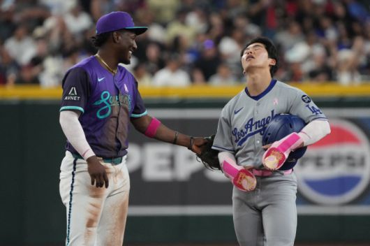 김혜성이 6회 2루타를 치고 나간 뒤 비디오 판독 끝에 아웃으로 판정이 번복되자 고개를 젖히며 아쉬워하고 있다. 애리조나 유격수 헤랄도 페르도모가 김혜성을 위로하고 있다. Imagn Images연합뉴스 |