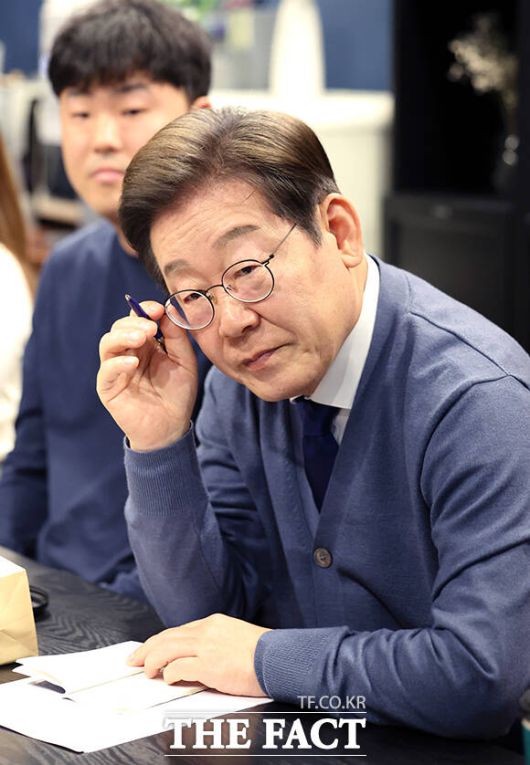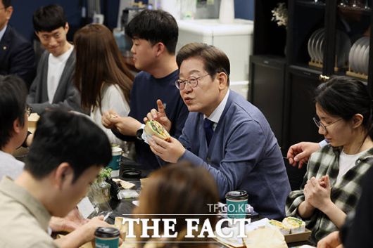 [더팩트ㅣ배정한 기자] 이재명 더불어민주당 대선 후보(오른쪽)가 제21대 대통령선거 공식 선거운동이 시작된 12일 경기 성남시 분당구 판교역 인근 미팅룸에서 열린 'K-혁신' 브라운백 미팅에서 IT 개발자들과 대화하고 있다.