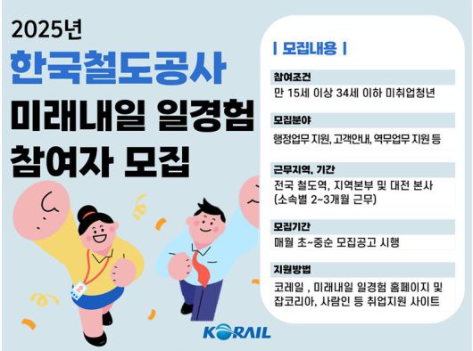 [파이낸셜뉴스] 한국철도공사(코레일)는 12일 미취업 청년들의 취업역량 강화를 위해 '미래내일 일경험' 사업을 본격 추진한다고 밝혔다.
