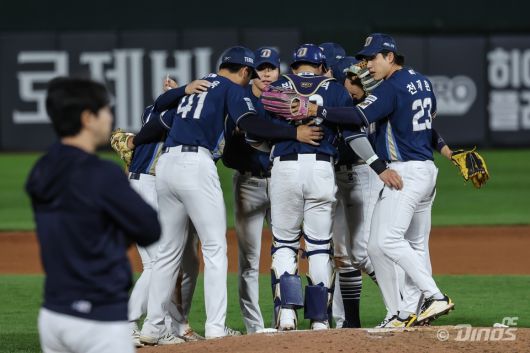 NC 선수단이 승리를 거둔 후, 마운드에 모여 자축하고 있다. 사진=NC다이노스 제공 |