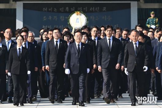 이재명 더불어민주당 대선후보가 지난달 28일, 서울 동작구 소재의 국립현충원 참배를 마친 후 전직 대통령 묘소로 향하고 있다. ⓒ사진공동취재단 |