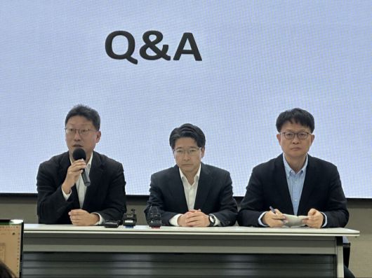 김희섭 SK텔레콤 PR센터장, 임봉호 SK텔레콤 MNO사업부장, 류정환 SK텔레콤 네트워크인프라센터장(왼쪽부터)이 12일 오전 열린 일일 브리핑에서 취재진 질문에 답하고 있다. 사진=이화연 기자 |