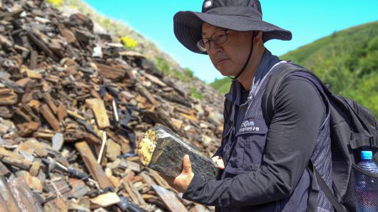 KIGAM 연구진이 해외 리튬 유망 지역의 광물을 조사하고 있다.[KIGAM 제공] |