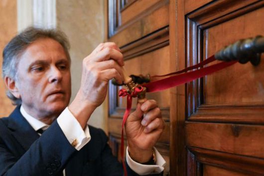 프란치스코 교황이 선종한 지난달 21일 바티칸 사도궁이 교황청 관계자에 의해 봉인되고 있다. 바티칸=바티칸뉴스 AFP 연합뉴스 |