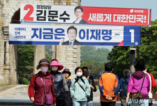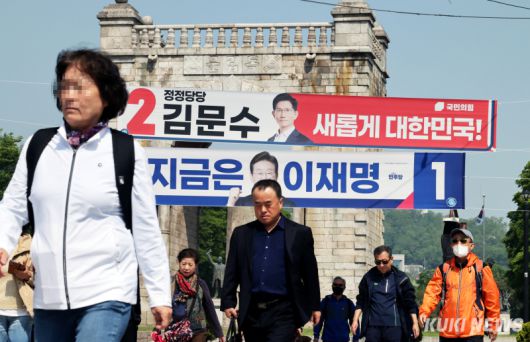 제21대 대통령선거 공식 선거운동 첫날인 12일 서울 서대문구 독립문 앞에 이재명 더불어민주당 후보와 김문수 국민의힘 후보의 현수막이 걸려 있다. |