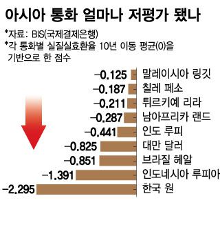 블룸버그통신이 국제결제은행(BIS)의 실질실효환율(REER·한 국가 통화의 가치를 다른 주요 통화로 구성된 지수 또는 바스켓 대비 가중 평균한 값) 데이터를 분석한 결과 한국 원화가 10년 이동평균 대비 가장 많이 하락했다. 인도네시아 루피아화, 브라질 헤알화, 대만 달러, 인도 루피화가 뒤를 이었다.