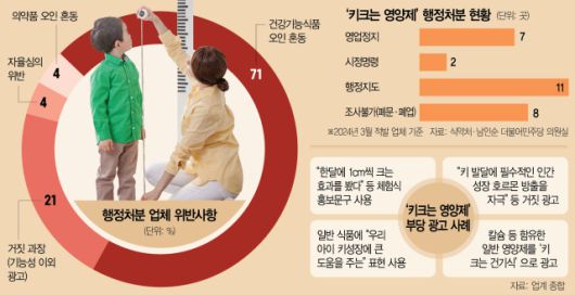 키 성장에 대한 부모들의 관심이 커지면서 ‘키 크는 건강기능식품’ 과대·거짓광고가 범람하고 있지만 처벌 수위가 약해 어린이 건강이 우려된다. 키 성장 기능성 원료를 사용하지 않았는데도 관련 영양제로 둔갑하거나, “수개월 만에 10cm이상 컸다” 같은 체험식 과장 홍보 문구로 반짝 매출을 올리는 곳들이 많다. 특히 상습적으로 한탕 수익을 올린 후 사업체를 폐업해 당국의 행정처분을 피하는 곳들도 꽤 있는 것으로 확인됐다. 전문가들은 “당국의 제재가 행정처분에 그쳐 수위가 약하다”며 “처벌을 강화할 필요가 있다”고 입을 모으고 있다.