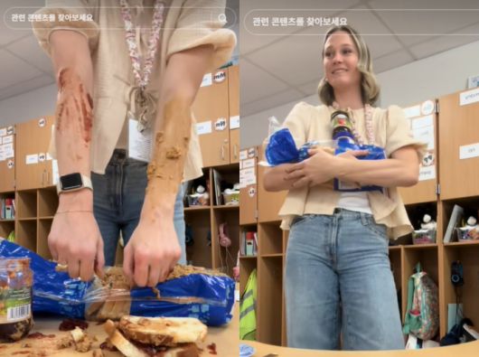 그가 땅콩버터가 담긴 통에도 손을 넣고 포장지 위에 바르자, 학생들은 비명을 질렀다. 한 학생은 “땅콩버터와 딸기잼 샌드위치는 그렇게 만들면 안 돼요!”라고 외쳤다.