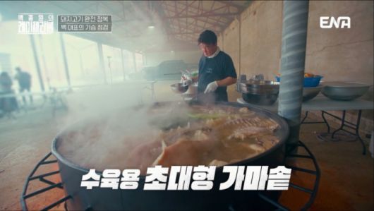 백종원 더본코리아 대표가 예능 '백종원의 레미제라블'에서 돼지고기 수육을 만들 때 사용한 초대형 가마솥. /사진=ENA 방송화면 캡처 |