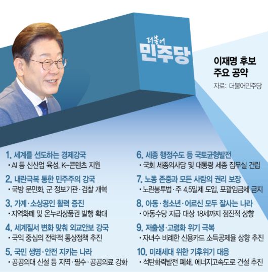 민주당은 12일 이 후보의 10대 정책 공약을 공개하면서 “세계를 선도하는 경제 강국을 만들겠다”고 강조했다. 진성준 선대위 정책본부장은 국회 기자 간담회에서 “급변하는 대외 환경과 저출생·저성장 위기에서 경제성장에 집중해 국민 모두가 행복한 삶을 살아갈 수 있는 진짜 대한민국을 만들고자 한다”고 말했다.
