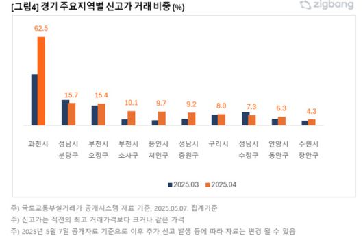경기도에서는 과천시가 4월 전체 거래 중 62.5%가 신고가 거래로 집계되며 가장 높은 비중을 보였다. 과천푸르지오써밋, 래미안슈르, 과천자이 등 주요 고가 단지를 중심으로 거래가 형성되며, 서울 강남과 유사하게 고급 주거지에 수요가 집중되는 양상이다. 성남시 분당구(15.7%)는 판교 백현동의 중대형 아파트와 수내·서현동 등 1기 신도시 내 리모델링 추진 단지를 중심으로 신고가 거래가 이어졌다. 서울 접근성과 개발 기대가 맞물리며, 입지 선호도가 높은 지역에 선택적 매수세가 유입되는 모습이다.