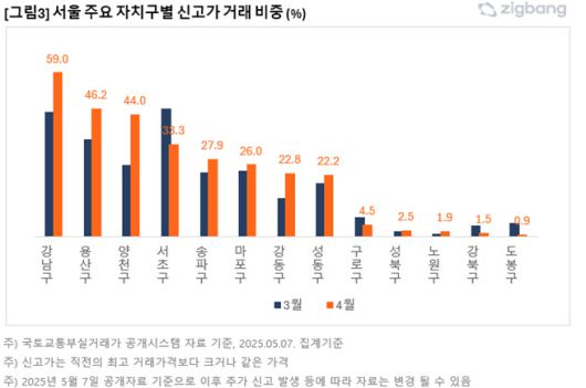 서울 지역별 신고가 거래 비중을 살펴보면, 주요 지역 간 차이가 뚜렷하게 나타났다. 강남구는 2025년 4월 전체 거래의 59.0%가 신고가에서 이뤄지며, 2022년 4월(53.7%) 이후 처음으로 절반을 넘어섰다.