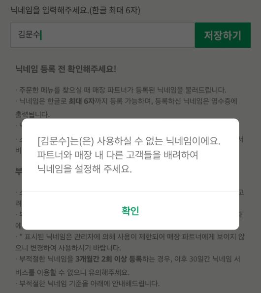 스타벅스 코리아의 부적절한 닉네임 기준으로는 ▲ 사회통념에 어긋나는 표현 ▲ 타인을 직접적으로 비방하는 표현 ▲ 매장 파트너가 콜링하기 곤란한 표현 ▲ 불쾌감을 주는 표현 등으로, 스타벅스 코리아는 '사회·정치적으로 어떠한 입장도 취하고 있지 않습니다'라는 문구도 포함돼 있습니다.