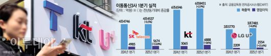 12일 통신 업계에 따르면, SK텔레콤·KT·LG 유플러스 올해 1분기 합산 영업이익은 1조5116억 원으로, 전년 동기 대비 23.3% 증가했다. 이날 실적을 발표한 SK텔레콤은 매출 4조4537억 원, 영업이익 5674억 원을 기록했다. KT는 매출 6조8451억 원 · 영업이익 6888억 원, LG유플러스는 매출 3조7481억 원, 영업이익 2554억 원을 거뒀다.