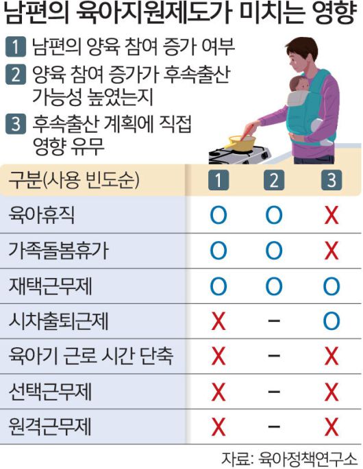 A씨 사례처럼 남편의 육아휴직, 가족돌봄휴가, 재택근무제가 양육참여를 유의미하게 높여 부인의 후속 출산 의향에 긍정적인 영향을 미친다는 연구 결과가 나왔다. 저출생 문제 해결을 위해 이들 제도가 중소기업에서도 실질적으로 활용되도록 행정적 지원이 필요하다고 연구진은 제언했다.