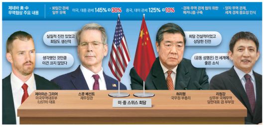 이번 제네바 회담에 미국 측에선 베선트 장관, 제이미슨 그리어 무역대표부(USTR) 대표가 참석했고, 중국 측에서는 허리펑 국무원 부총리, 리청강 상무부 국제무역담판대표 겸 부부장, 랴오민 재정부 부부장 등이 자리했다.