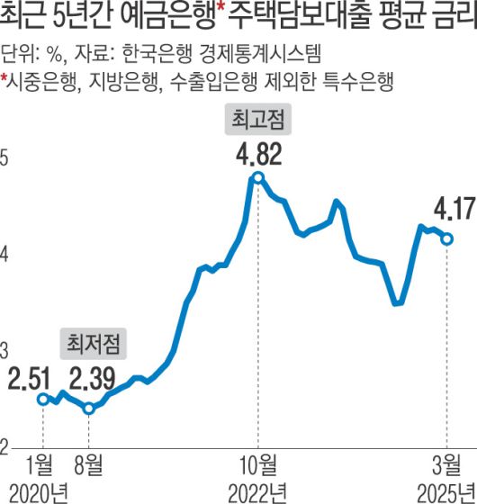 한국은행 경제통계시스템을 보면 올해 1~3월 예금은행 주택담보대출금리(신규취급액 기준)는 평균 4.22%(4.17~4.27%)로 2020년 1~3월 평균 2.5%(2.48~2.52%)보다 1.72%포인트 올랐다.