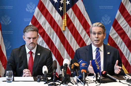 베선트 미 재무장관 “실질적 진전” 스콧 베선트 미국 재무장관(오른쪽)과 제이미슨 그리어 미 무역대표부 대표가 12일(현지시간) 스위스 제네바에서 미·중 무역 협상 결과를 발표하고 있다. AFP연합뉴스 |