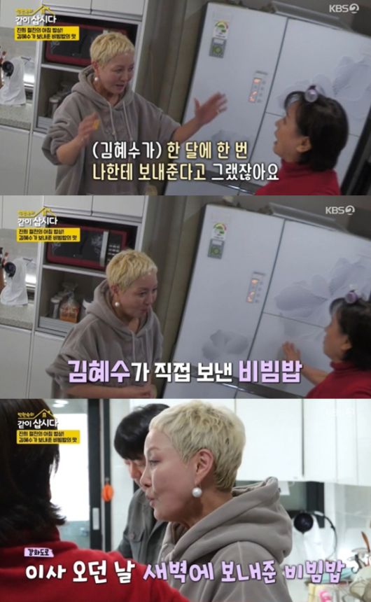 그러나 다행이 비빔밥이 남아있었다. 이에 대해 홍진희는 "그거 (김)혜수가 보내준 거다. 걔가 한 달에 한 번 나한테 보내준다고 하지 않았냐. (강화도로) 이사 오던 날 새벽에 보내준 거다"라고 전했다.