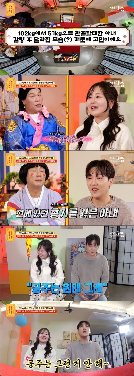 12일 오후 방송된 KBS Joy ‘무엇이든 물어보살’에서는 1년 반 만에 45kg 감량에 성공한 아내가 돌변해 고민이라는 부부가 등장했다.