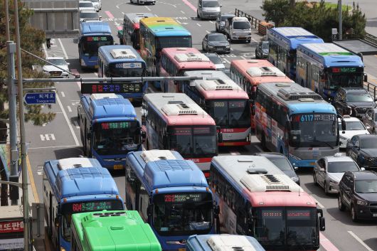한국노총 전국자동차노조연맹은 8일 전국 대표자회의를 열고 서울, 부산, 인천, 경기 등 22개 지역 전국자동차노동조합연맹 산하 시내버스 노조가 노사교섭 결렬 시 오는 28일 동시 총파업을 예고했다. 사진은 8일 서울역 앞 버스환승센터 정류장 버스 모습./연합뉴스 |
